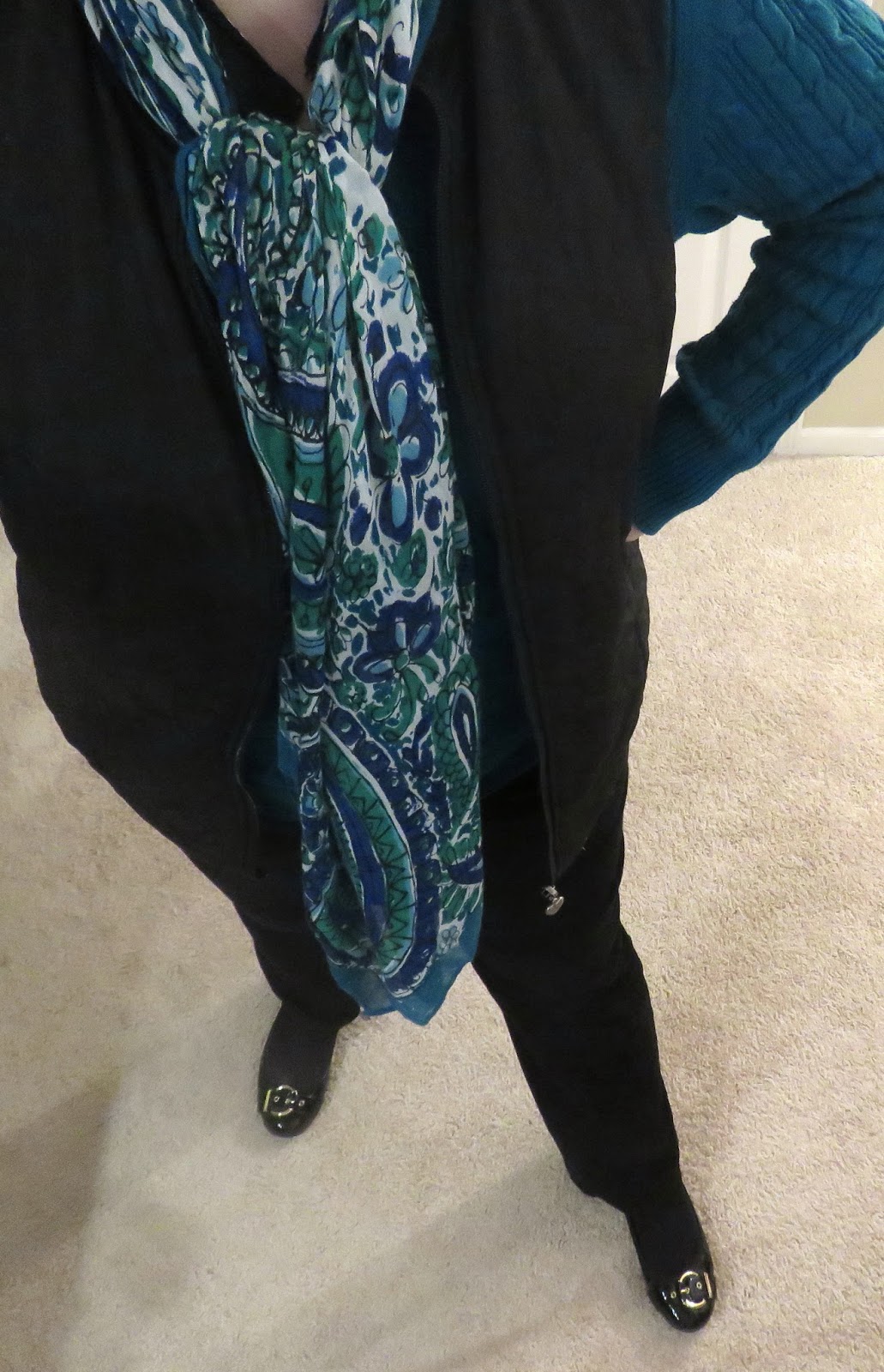 This blouse keeps challenging me with new ways to wear it, so I decided jeans, a navy scarf, and leopard print smoking slippers was a good Friday option. I do ascribe to the concept that leopard print is a neutral, but admit to feeling a little twinge of happy matchy feeling when I saw that the orange-ish tone of the shoes brought out the yellow centers in the flowers.